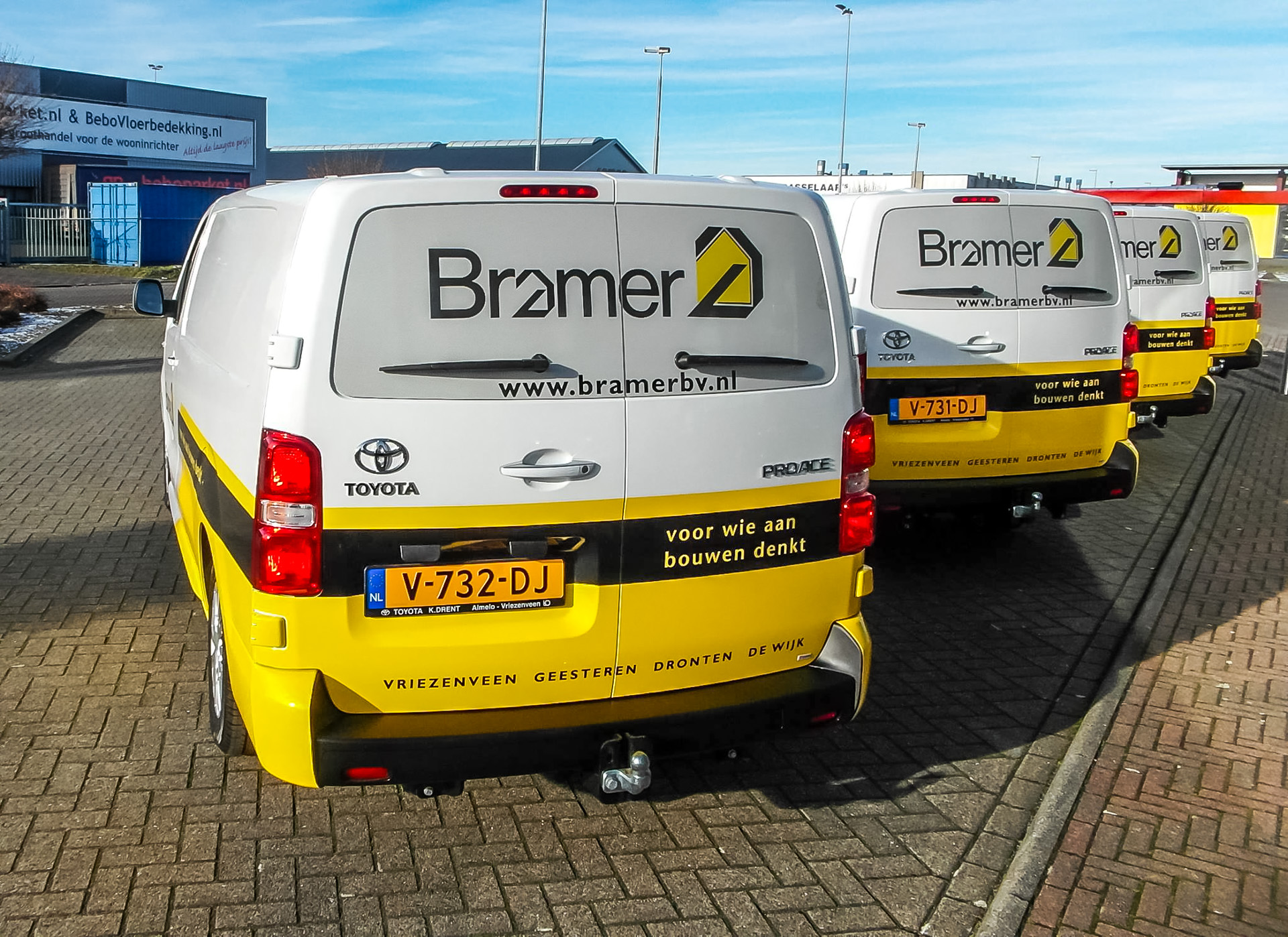 Aannemersbedrijf Bramer vroeg ons het ontwerp voor de belettering van een reeks nieuwe bussen in een modern jasje te steken. Wij verrasten ze met de restyling van de complete huisstijl, omdat wij van mening zijn dat autoreclame hier een belangrijk onderdeel van is. Uit de reeks hebben wij er inmiddels 4 in de de nieuwe uitstraling beletterd.