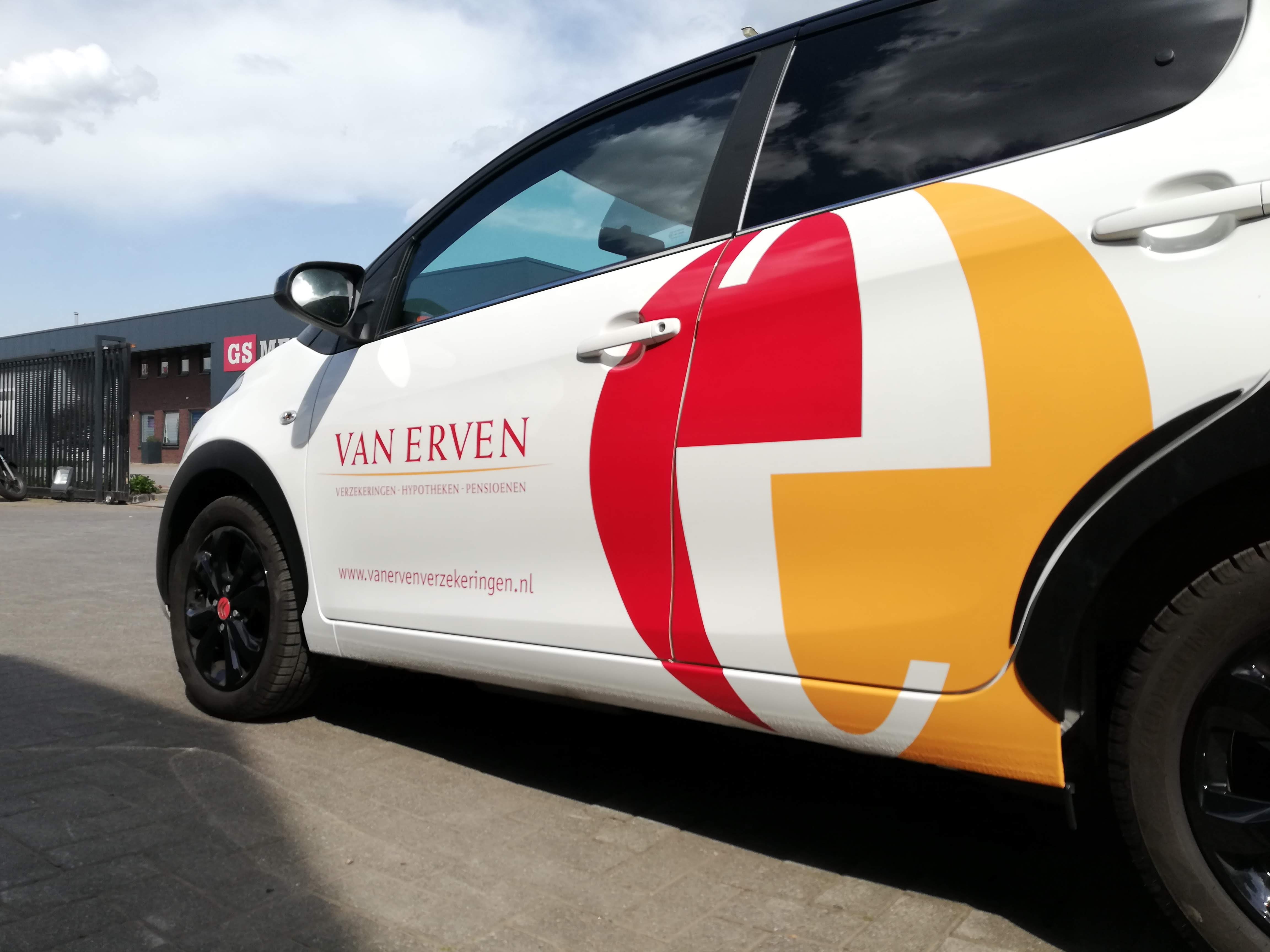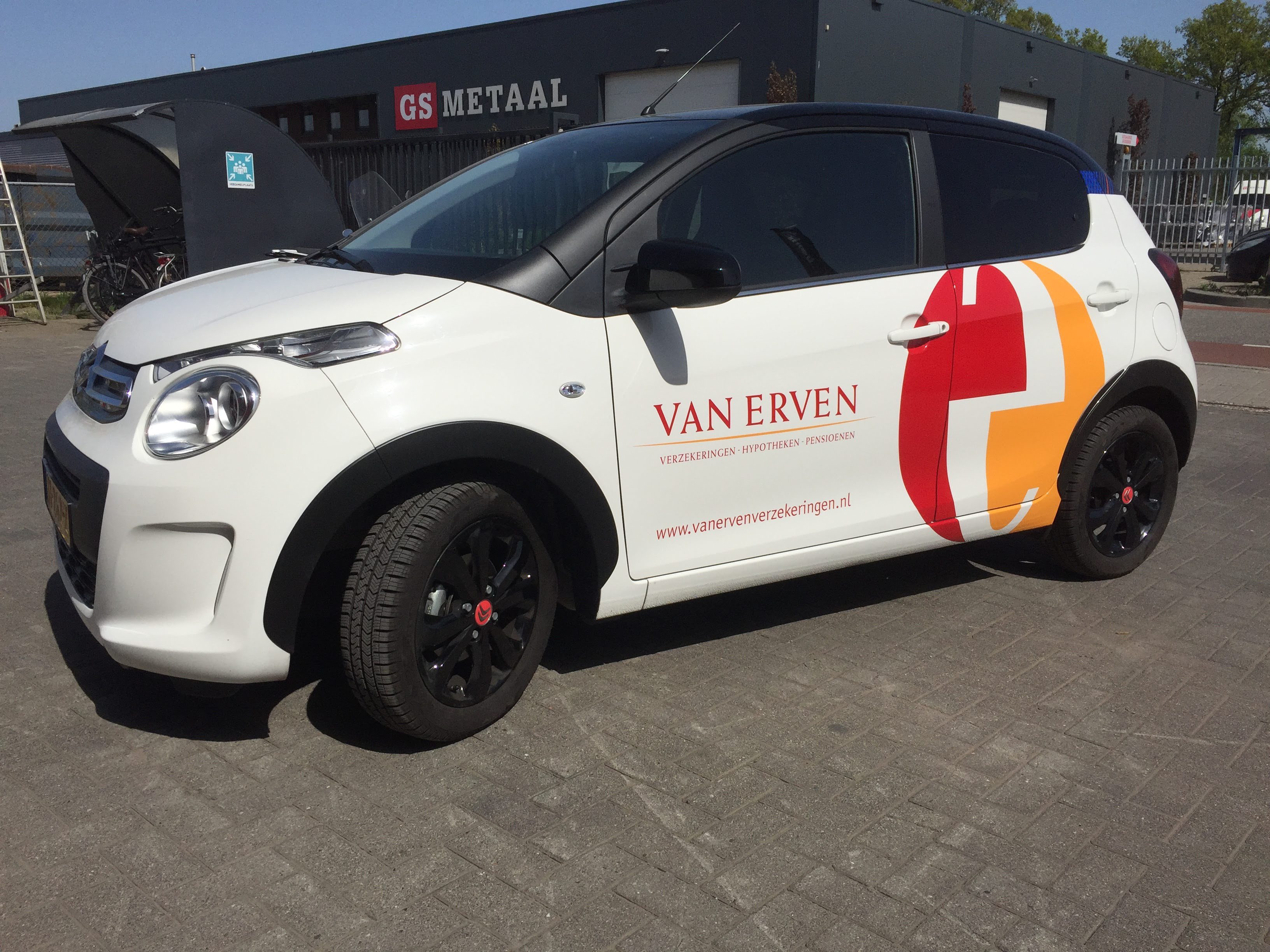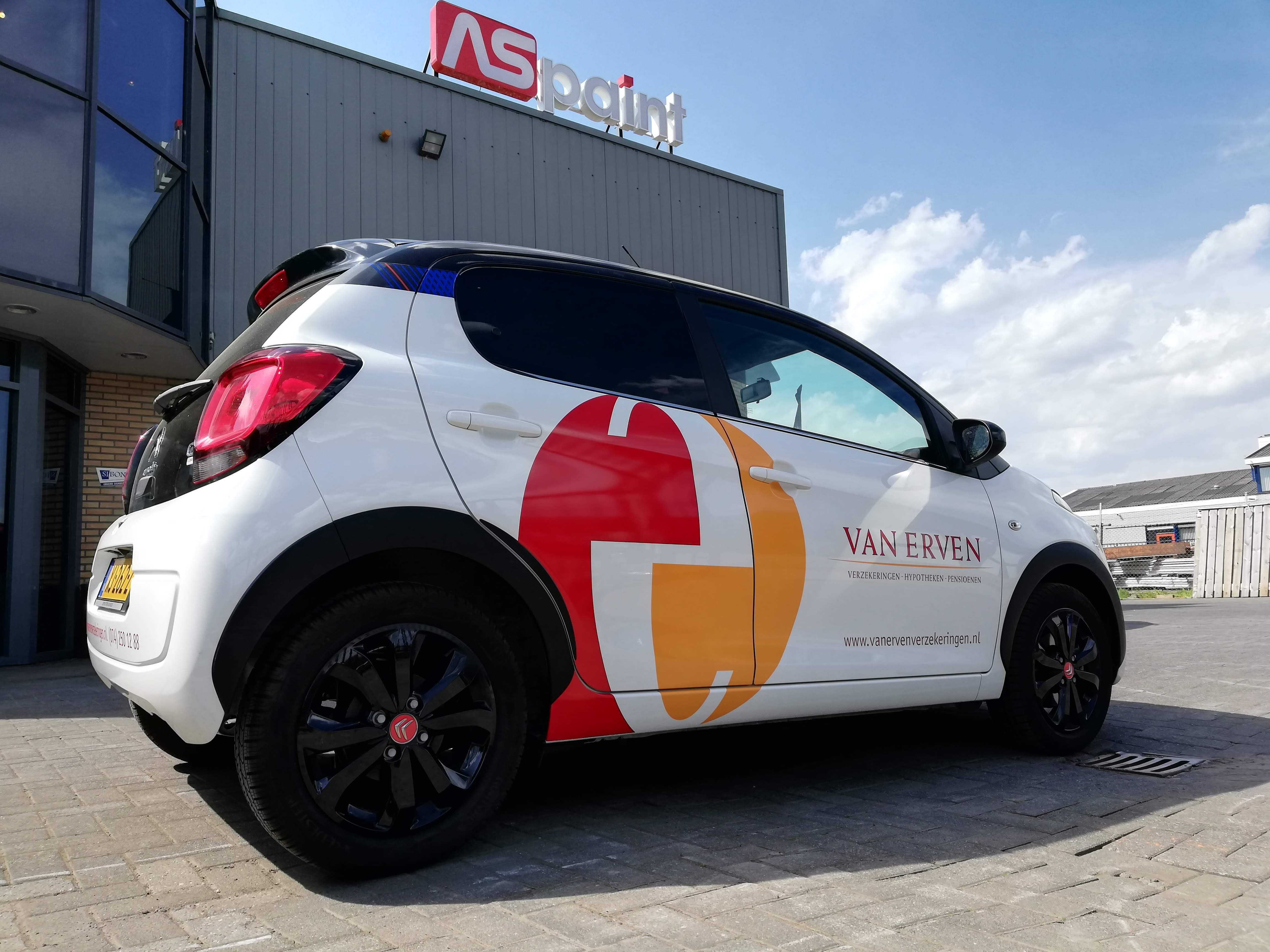 Voor Van Erven verzekeringen uit Hengelo is deze Citroën C1 voorzien van belettering. De belettering is uitgevoerd met hoogwaardige snijfolies in de Avery 900 serie.