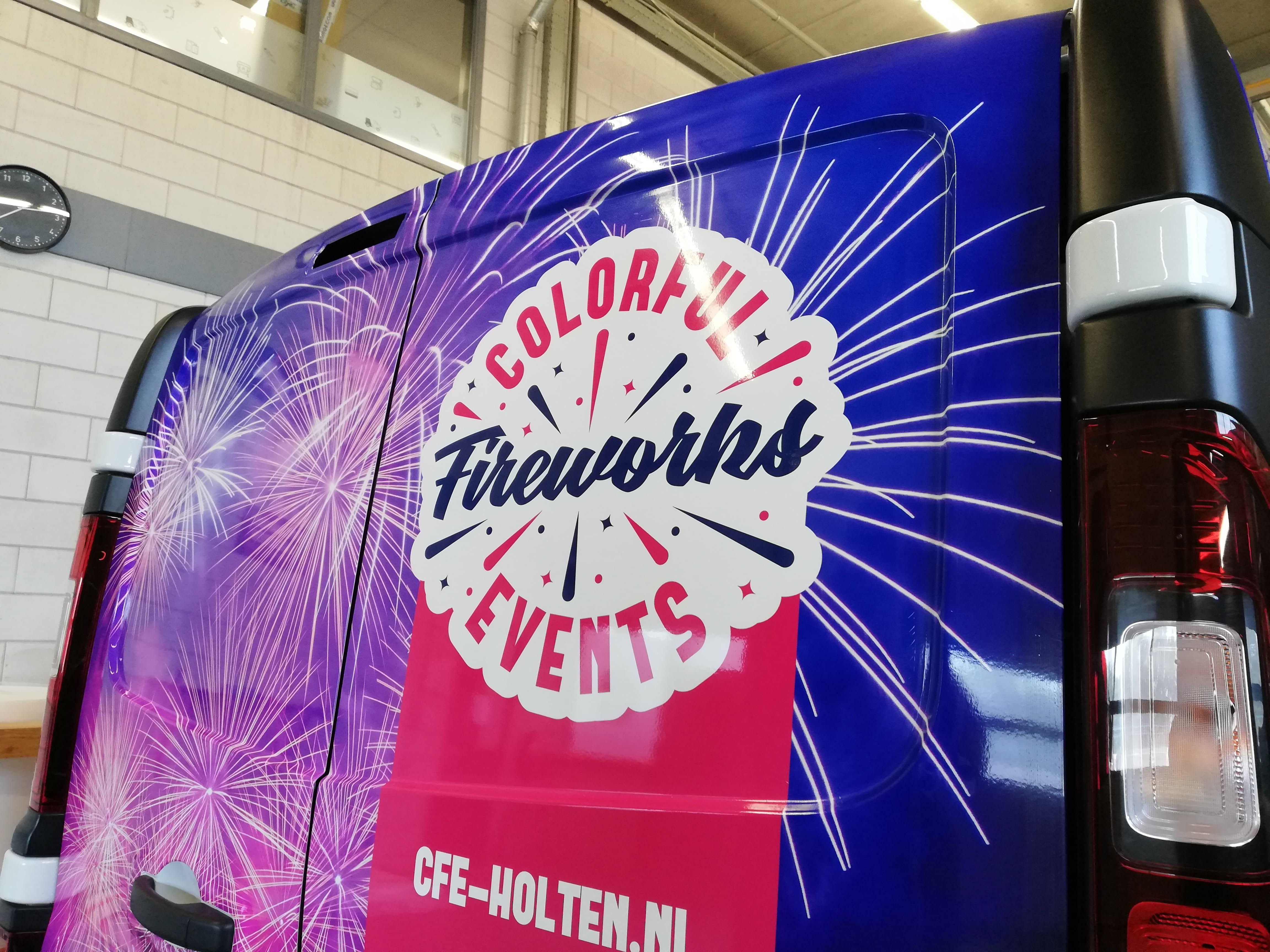 De autobelettering hebben we mogen ontwerpen en realiseren van deze Fiat Talento voor Colorful Fireworks Events. Dit uiteraard met een knallend resultaat. Voor de visuals aan de achterzijde van de bus hebben we gebruik gemaakt van een full color geprint carwrap vinyl. Door gebruik te maken van geprinte carwrap folie behoudt de print zijn kleur ondanks de vervormingen. De print is voorzien van een glanslaminaat, zodat deze lang mooi blijft. Het logo en de teksten zijn uitgevoerd met gegoten snijfolies.
