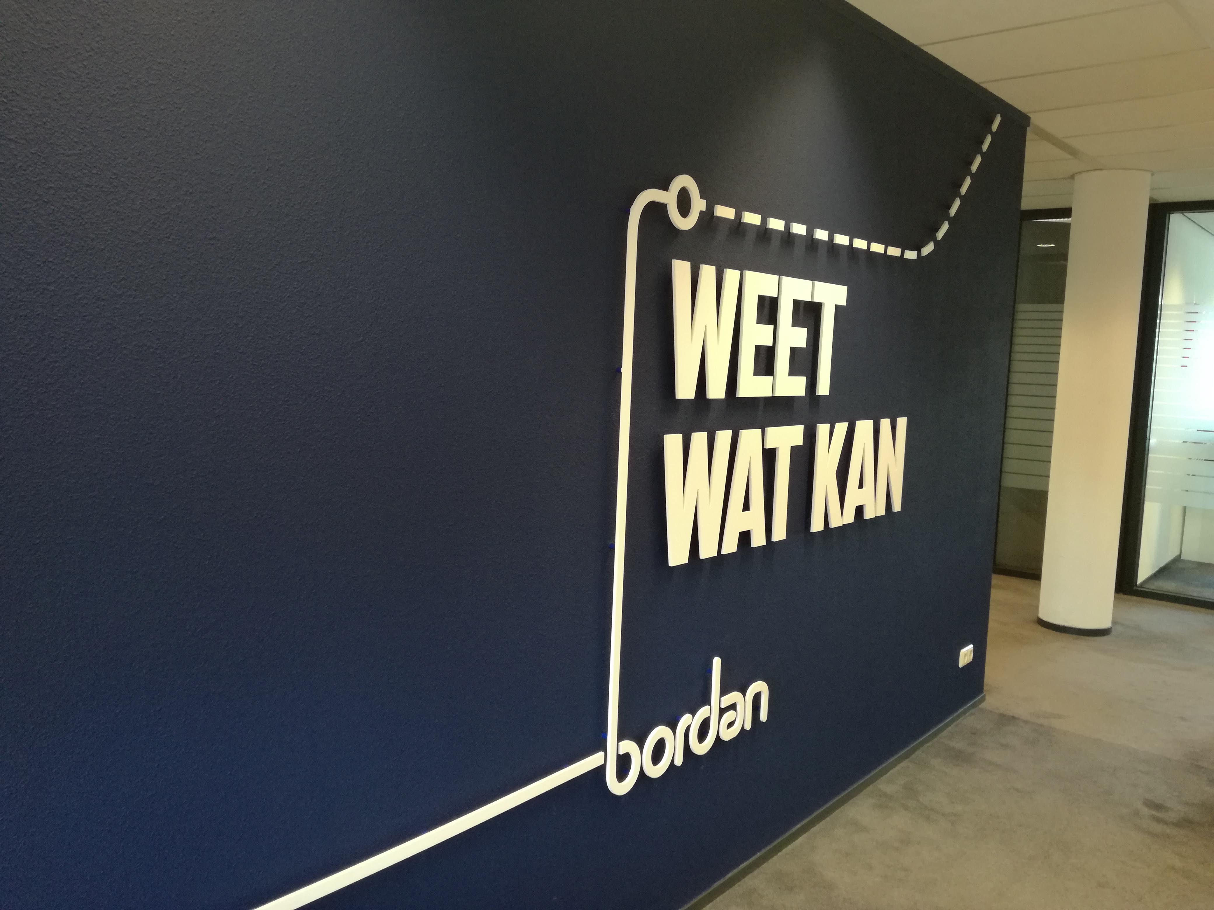 Voor Bordan Accountants in Almelo en Rijssen verzorgden wij de montage van freesletters. Dit 5mm dik geschuimd PVC is in contour gefreesd en zowel op afstand als vlak op de wand gemonteerd. Deze opdracht maakte deel uit van de huisstijlwijziging die Bordan in samenwerking met Stratetigsch ontwerpbureau Inc  doorvoerde. AS Paint verzorgde de levering en montage van alle binnenreclame en buitenreclame.
