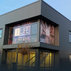 Raambelettering is dé manier om je pand op te laten vallen én tegelijkertijd privacy te creëren. Bij 1Life in Vriezenveen hebben we de raampartijen voorzien van geprinte oneway vision folie; een slimme vorm van raambelettering die zowel functioneel als stijlvol is.