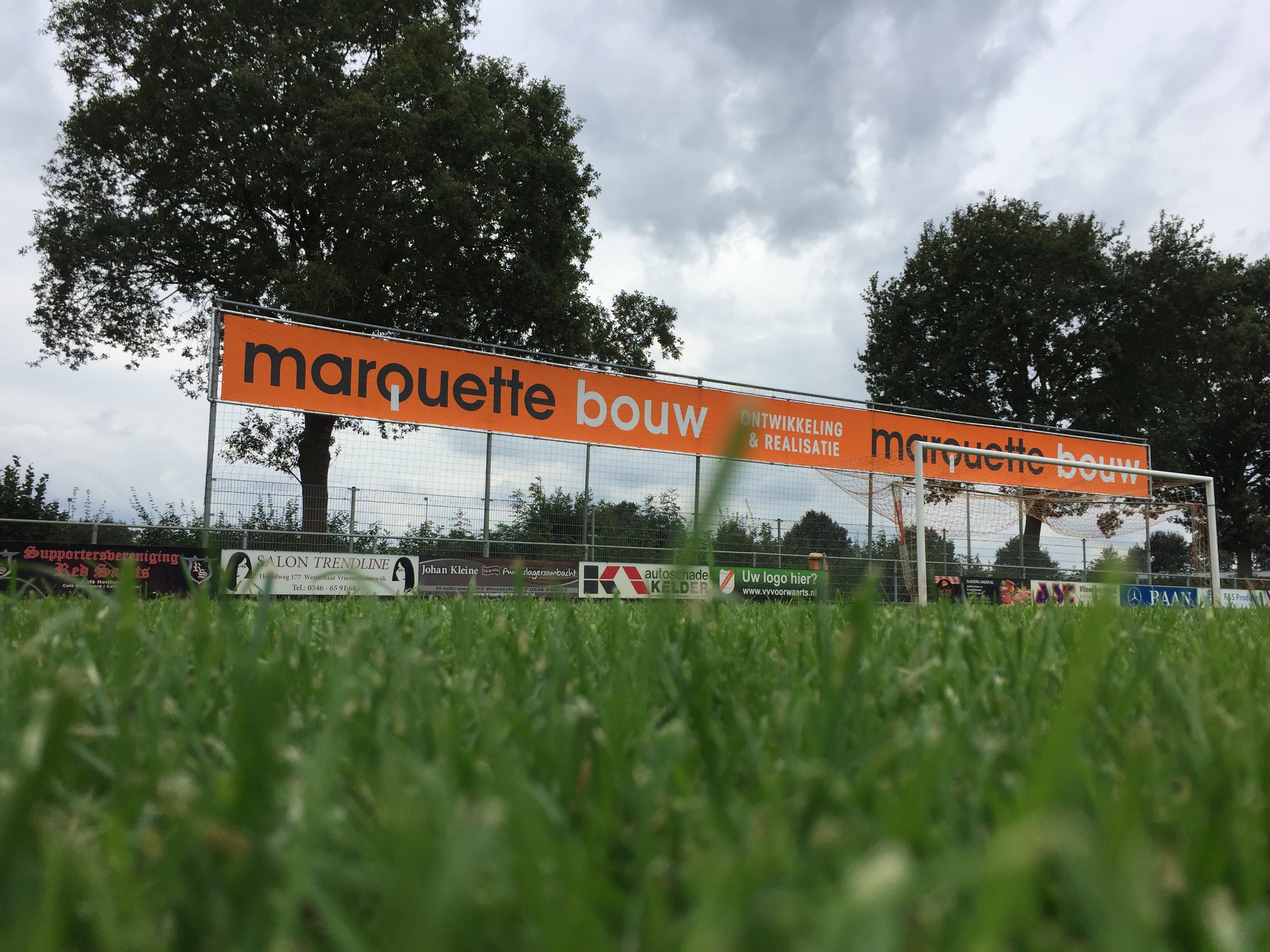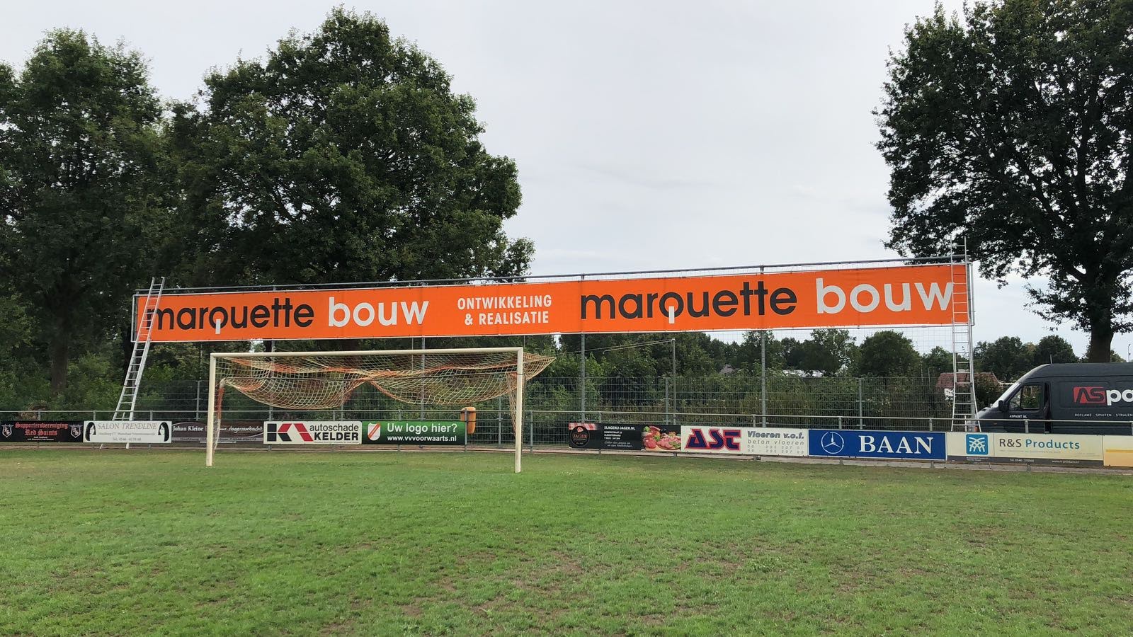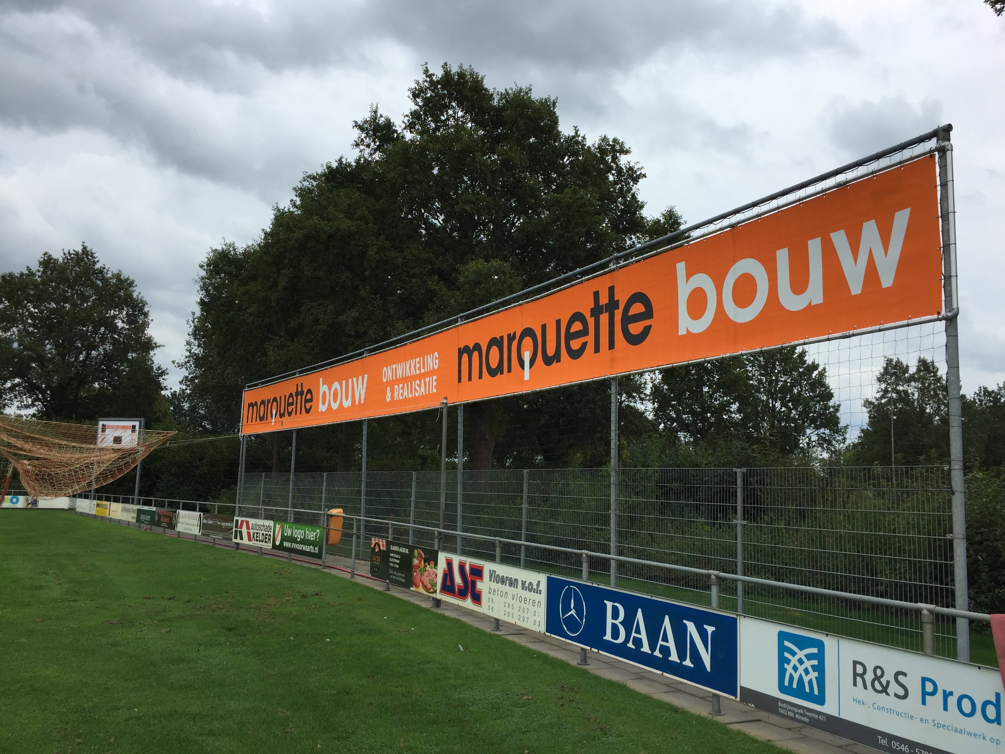 In opdracht van Marquette Bouw hebben wij bij V.V. Voorwaarts in Westerhaar een mega spandoekframe geplaatst van ruim 25×1,5m. Dit lichtgewicht spandoek van polyester brengt kleuren goed tot zijn recht. Marquette draagt veel lokale en regionale sportvereningen een warm hart toe. Met fraaie sponsoruitingen creëren ze op deze manier veel naamsbekendheid in de regio Twente, Overijssel.