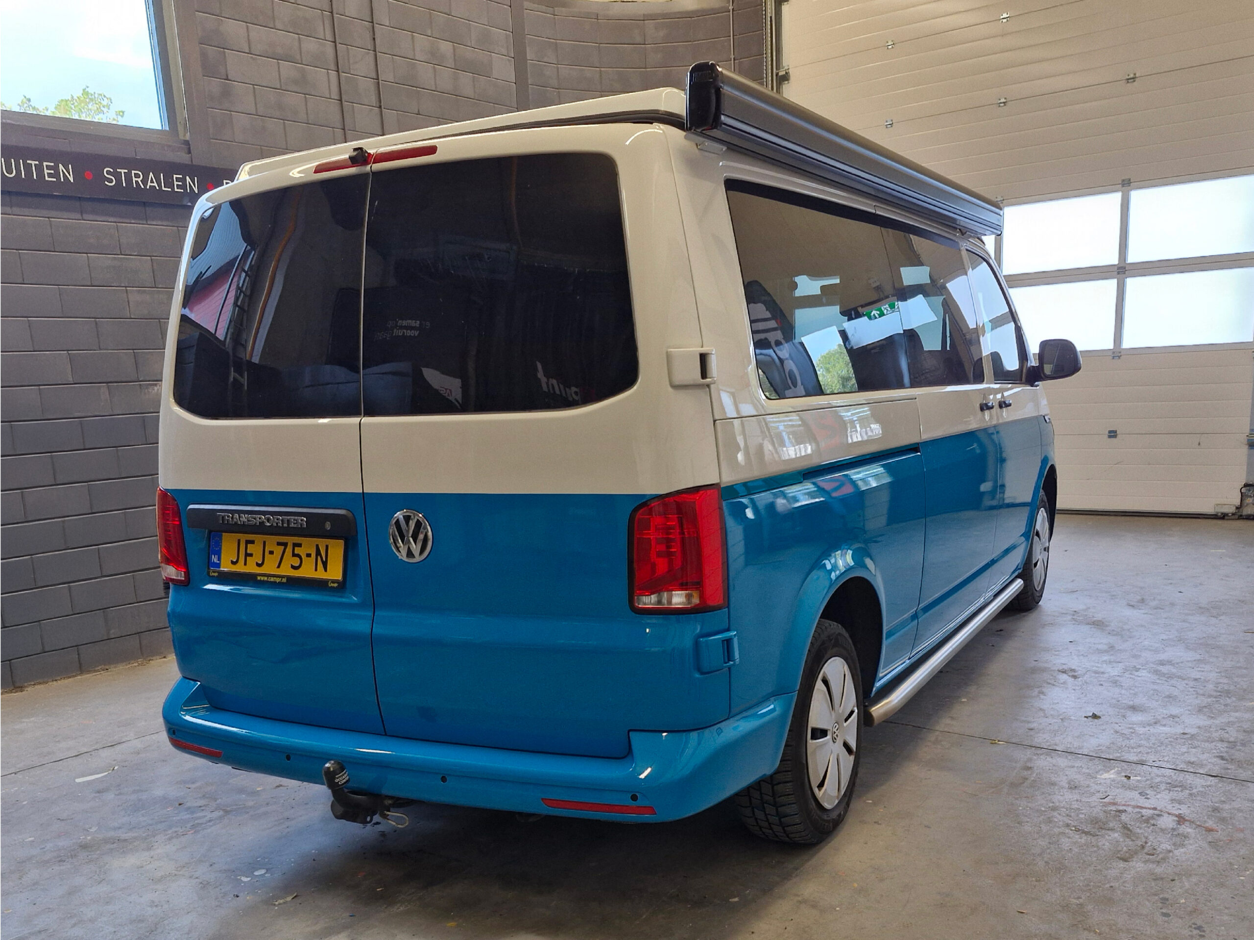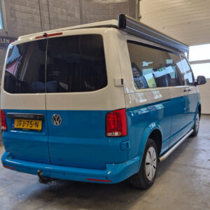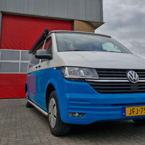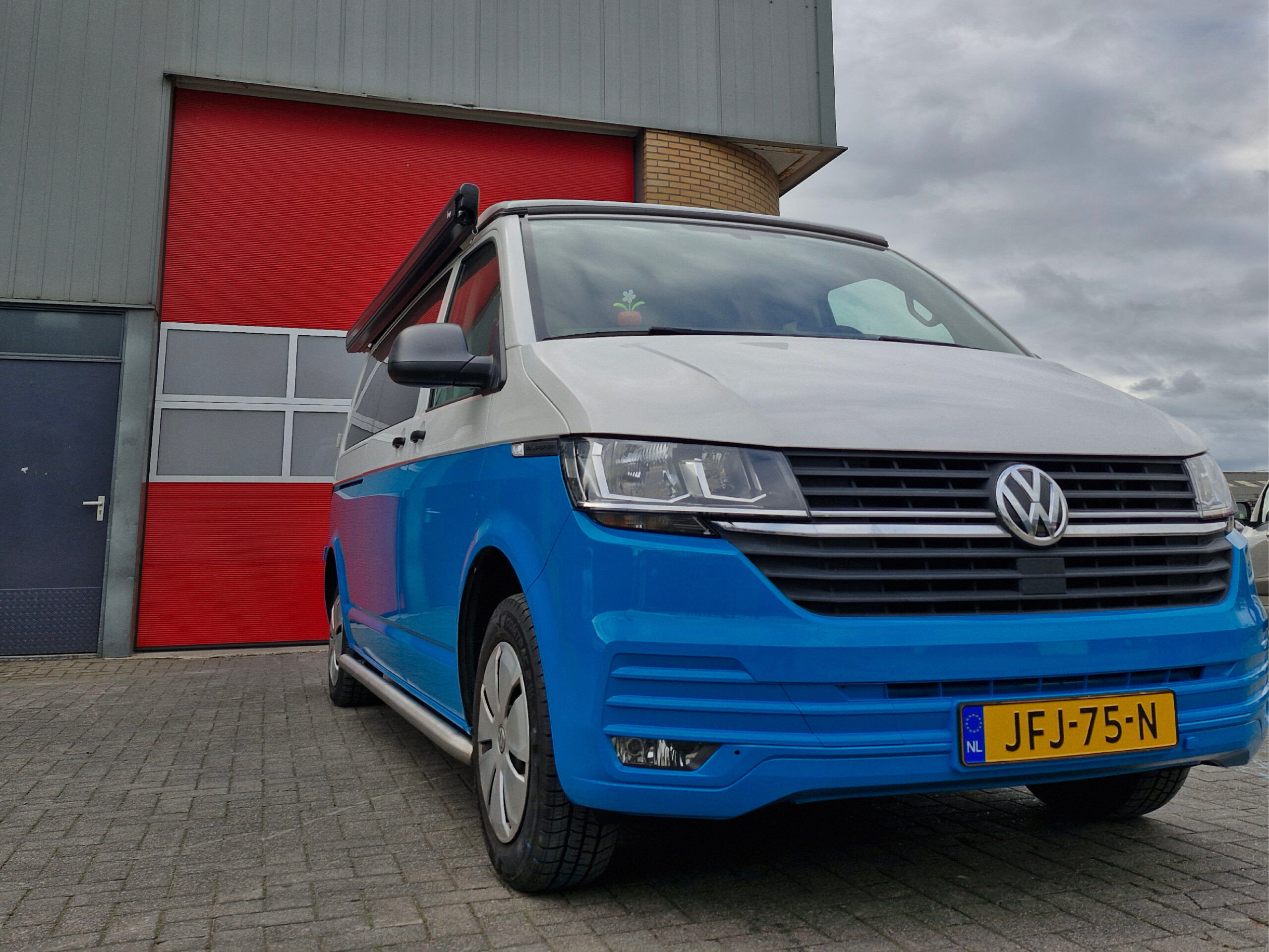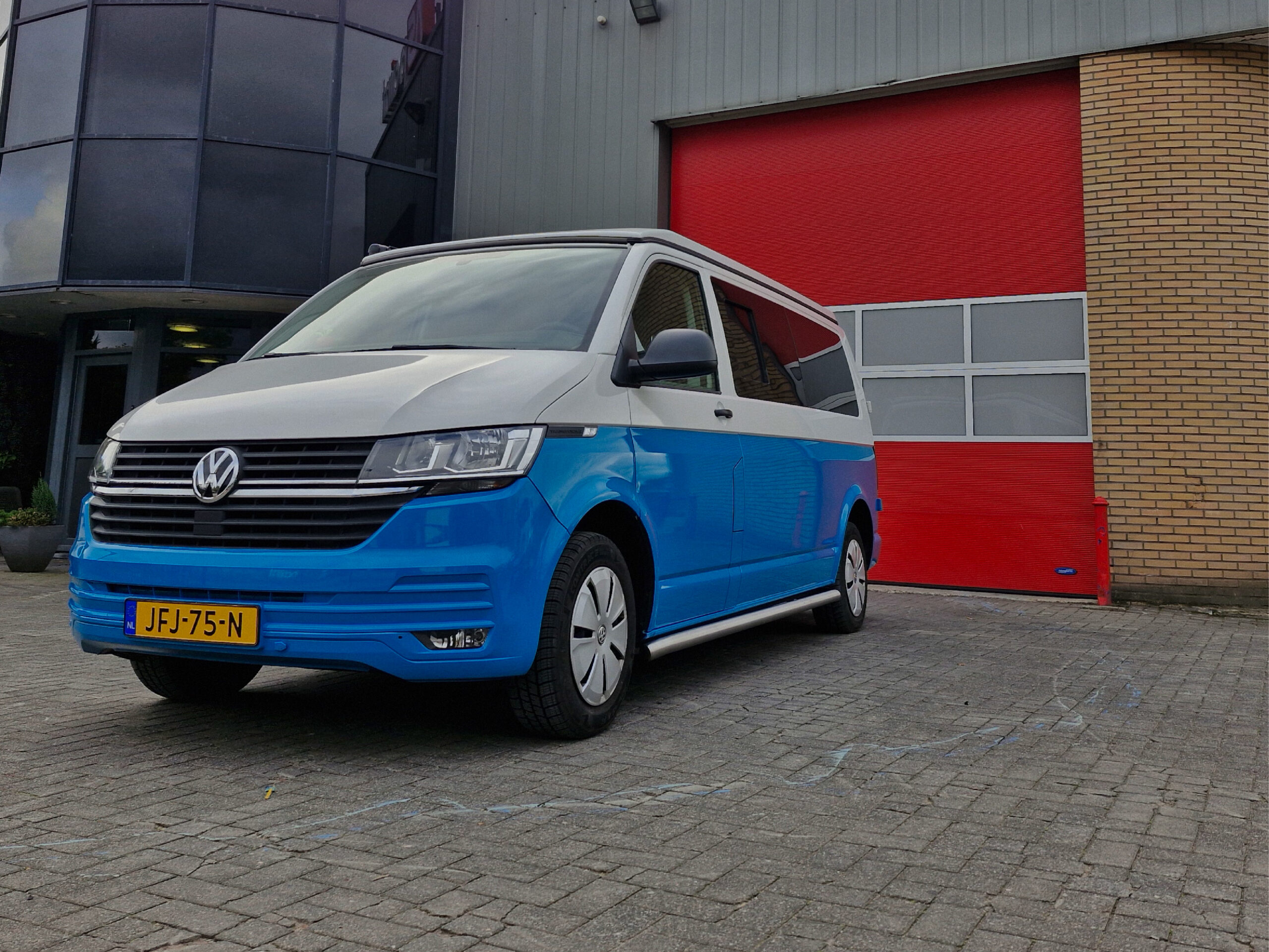 Deze omgebouwde VW camper kreeg een complete make-over met een duotone laklaag: onderkant in fris blauw gespoten, bovenkant klassiek wit gelaten.
